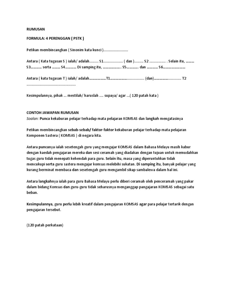 Soalan Rumusan Tingkatan 5 Soalan Rumusan 1. Contoh rumusan Bahasa Melayu tingkatan 4 Contoh dan Cara Buat Rumusan SPM KSSM Bahasa Melayu Terkini Pasti ramai yang masih tercari-cari Contoh dan Cara Buat Rumusan. LANGKAH-LANGKAH MENJAWAB RUMUSAN Baca arahan soalan.
